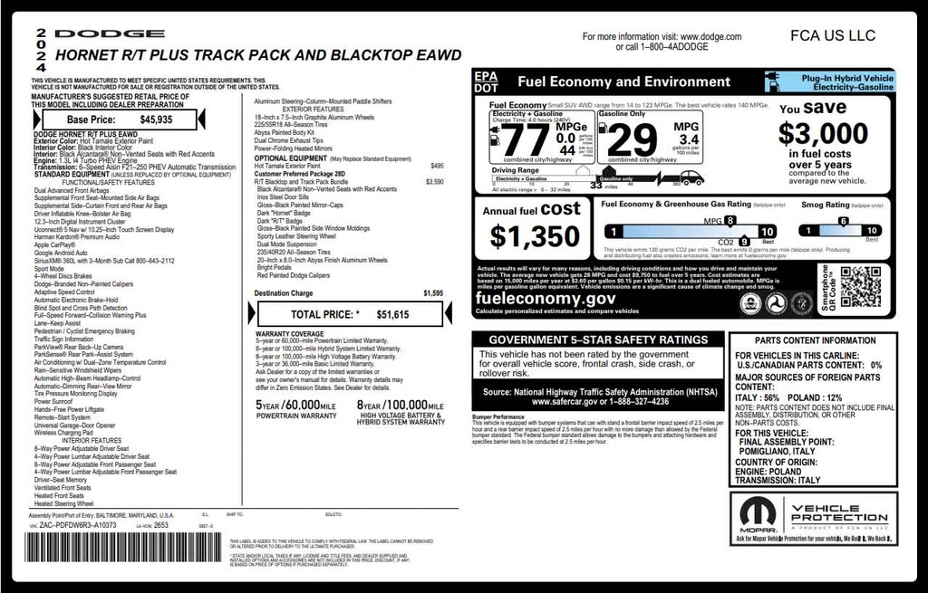 R/T BLACKTOP + TRACK PACK BUNDLE Michelin Brand Tires, Bright Pedals, Dual Mode Suspension, Steel Door Sills, Gloss Black Painted Day Light Opening, Red Brake Calipers, Tires: 235/40R20 All Season, Dark Hornet Badge, Sporty Leather Steering Wheel, Wheels: 20 x 8 Abyss Finish Aluminum, Dark R/T Badge, Gloss Black Painted Mirror Caps, TRANSMISSION: 6-SPEED AISIN F21-250 PHEV AUTO (STD), ENGINE: 1.3L I4 TURBO PHEV (STD).