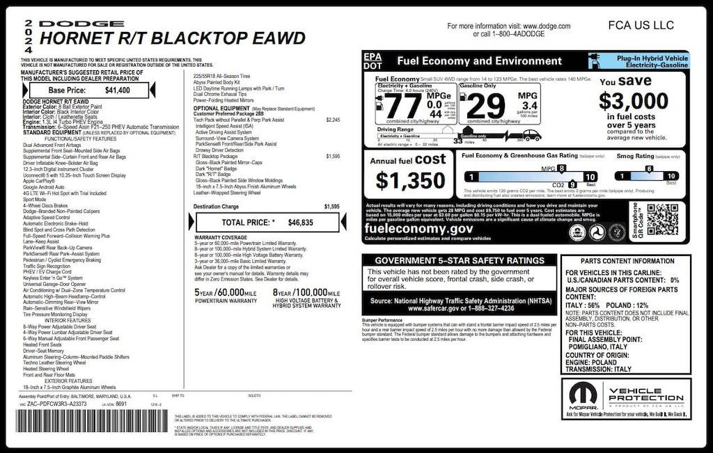TECH PACK W/O PARKING ParkSense Front/Rear/Side Park Assist, Active Driving Assist System, Surround View Camera System, Intelligent Speed Assist (ISA), Drowsy Driver Detection, R/T BLACKTOP PACKAGE Dark Hornet Badge, Gloss Black Painted Day Light Opening, Dark R/T Badge, Wheels: 18 x 7.5 Abyss Finish Aluminum, Gloss Black Painted Mirror Caps, TRANSMISSION: 6-SPEED AISIN F21-250 PHEV AUTO (STD), ENGINE: 1.3L I4 TURBO PHEV (STD).